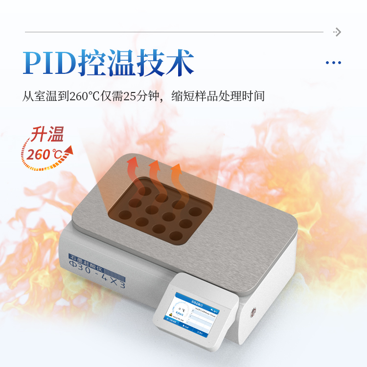 采用PID 控温技术,控温精度高,升温速度快, 从室温到260℃仅需25分钟。